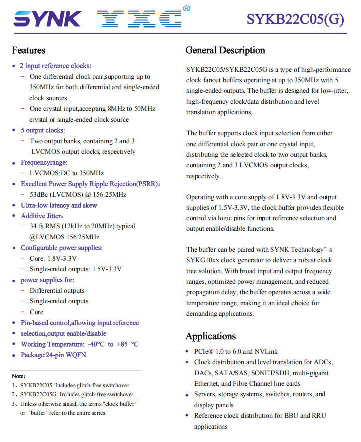 * SYKB22C05(G)是一款5路输出、超低抖动单端LVCMOS时钟缓冲器。支持2个输入参考时钟(一个差分/单端时钟输入,支持高达350MHz;一个晶体输入)。