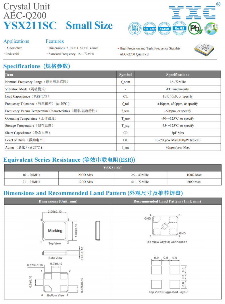 1¡¢50MHz³µ¹æÊ¯Ó¢¾§ÌåгÕñÆ÷£¬×ÜÆµ²î¡À80PPMÒÔÄÚ£¬¸ÃÎïÁÏËùÊô²úƷϵÁÐ2016³ß´ç£¬YSX211SCÖ§³Ö16MHz-72MHz¿íƵÂÊ·¶Î§£»
