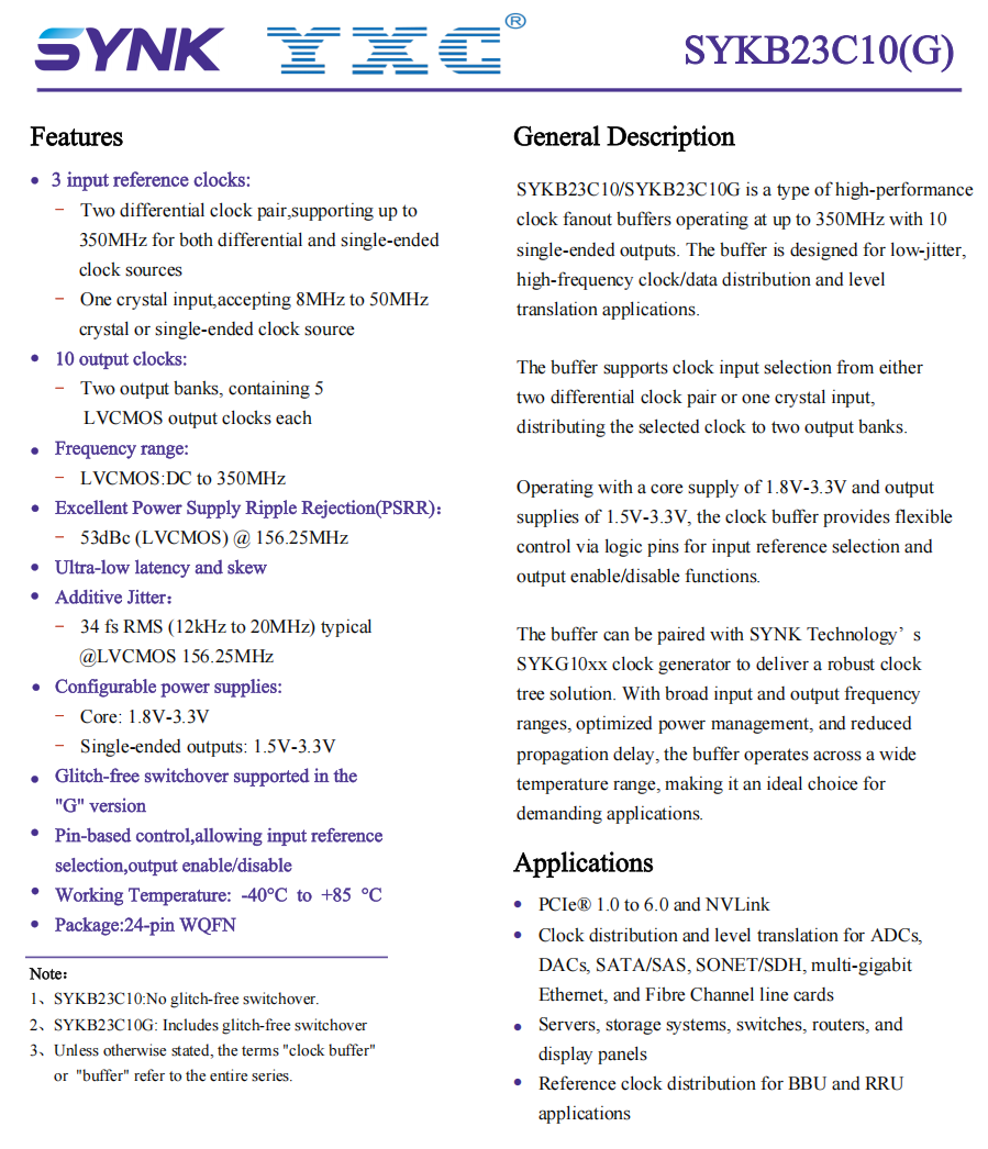 * SYKB23C10(G)是一款10路输出、超低抖动单端LVCMOS时钟缓冲器。支持3个输入参考时钟(两个差分/单端时钟输入,支持高达350MHz,以及一个晶体输入)。
