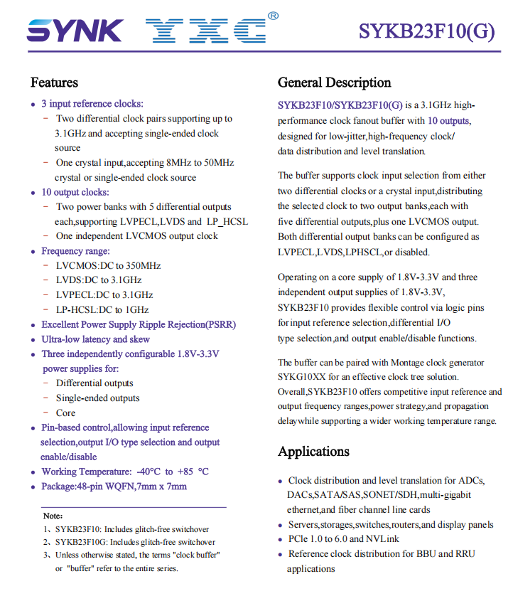 * SYKB23F10(G)是一款11路输出(10路差分输出+1路单端输出)超低加性抖动差分时钟缓冲器。